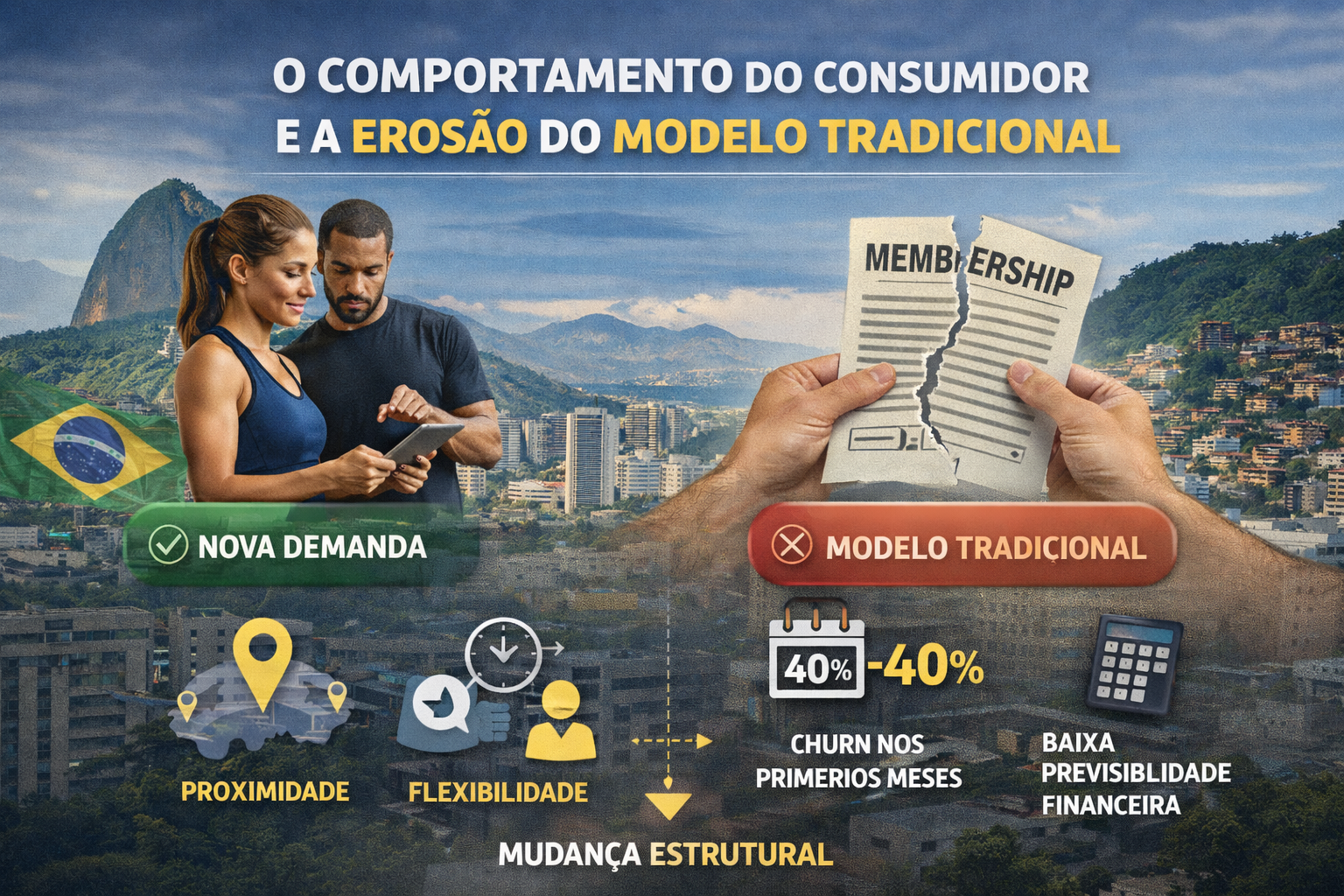 O modelo tradicional de academias, baseado em planos longos, experiência padronizada e baixa personalização, mostra sinais claros de desgaste. Relatórios setoriais indicam taxas elevadas de evasão, especialmente nos primeiros meses de matrícula, o que compromete a previsibilidade financeira do negócio.